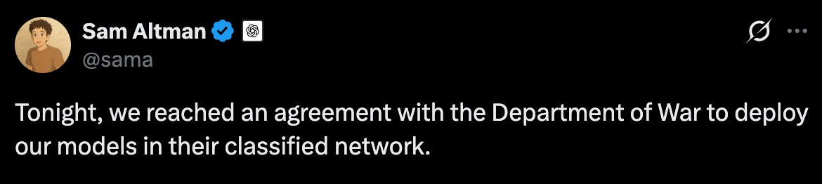 Hours later — same night — OpenAI announced their deal. “All lawful purposes.” Signed.